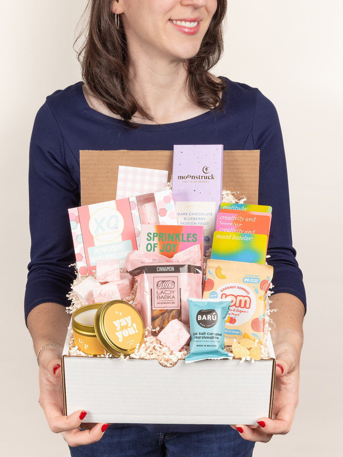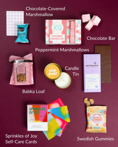 Features self-reflection cards, candle, chocolate bar, marshmallows, babka, Swedish gummies, chocolate caramel marshmallow, and your message on a handwritten note.