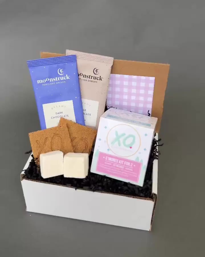 Features s'mores kit for two, drinking chocolates, and your message on a handwritten note.