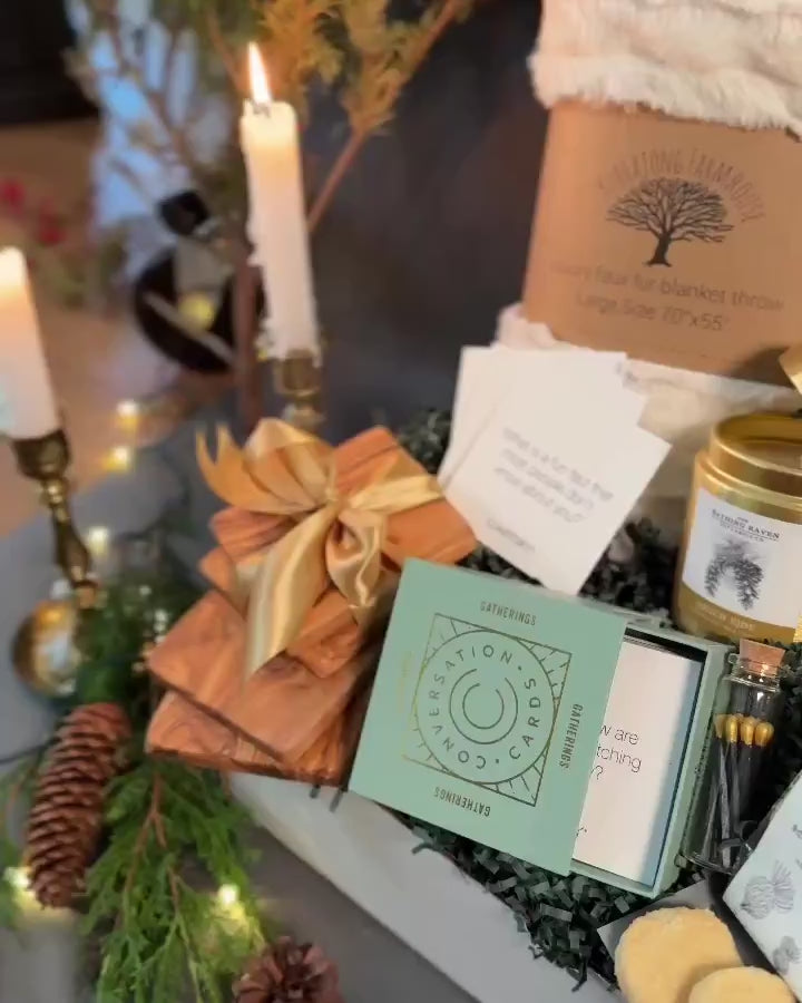Includes a cozy blanket, candied nuts, room spray, wooden coasters, candle, matches, taffy, chocolate, cookies, tea, sugar cubes, and your message on a handwritten note.