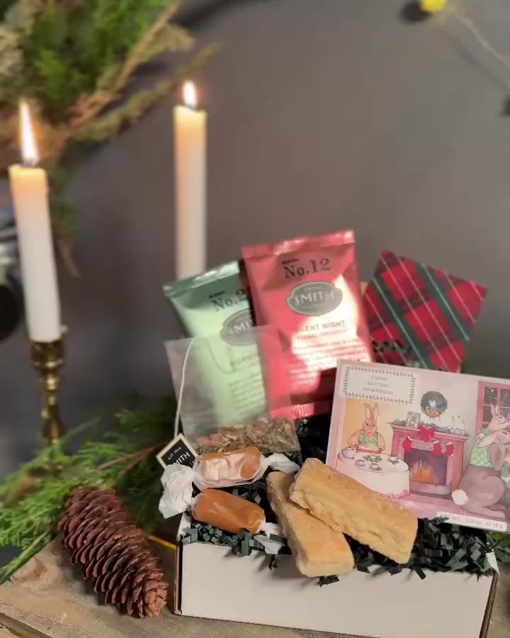 Features shortbread cookies, two holiday tea packets, caramels, and your message on a handwritten note.