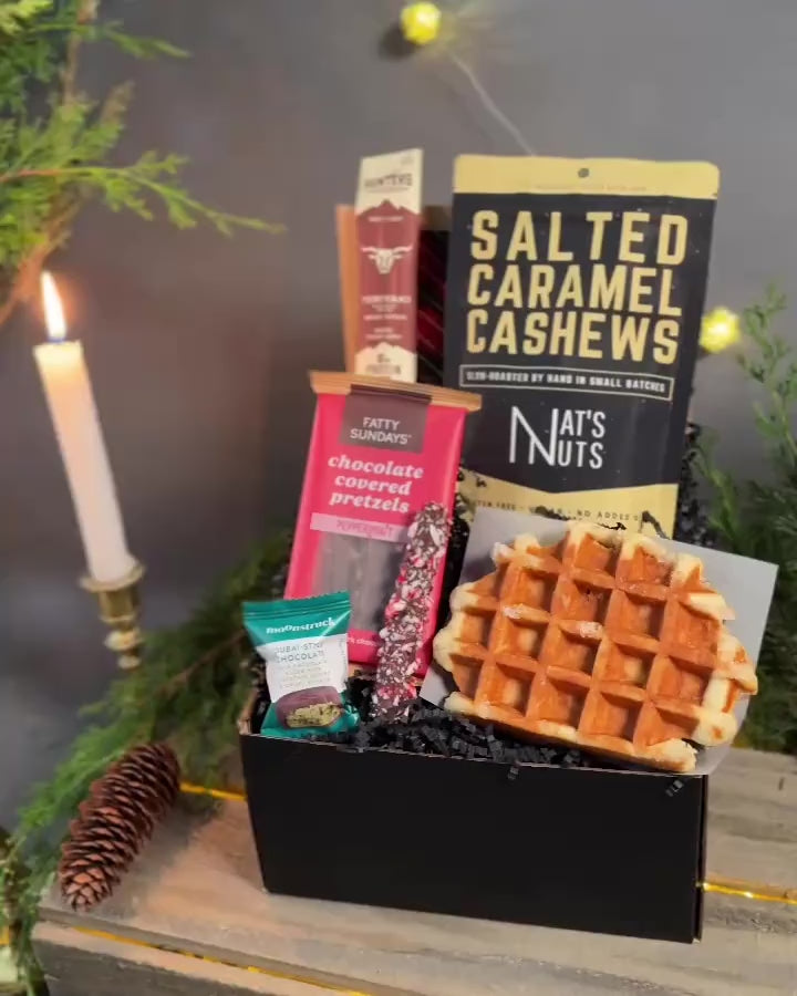Features salted caramel cashews, beef stick, chocolate-covered pretzels, a Belgian waffle, Dubai chocolate, and your message on a handwritten note.