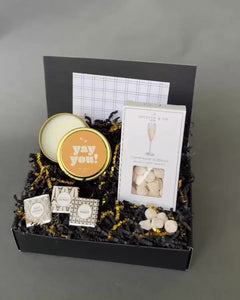 Features candle, chocolates, Champagne gummies, and your message on a handwritten note.