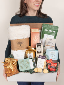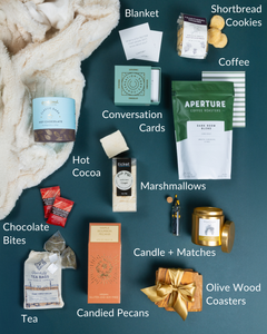Includes a cozy blanket, candied nuts, room spray, wooden coasters, candle, matches, taffy, chocolate, cookies, tea, sugar cubes, and your message on a handwritten note.