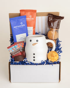 Feature super cute snowman mug, cinnamon doughnuts, two drinking chocolate packets, two chocolate bites, and your message on a handwritten note.