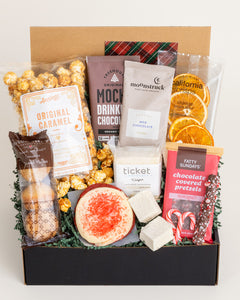 Features caramel popcorn, drinking chocolate packets, marshmallows, citrus crisps, red velvet cookie, peppermint chocolate covered pretzels, cinnamon doughnuts, and your message on a handwritten note.
