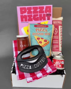 Includes pizza dough mix, pizza sauce, pepperoni, herb board, pizza cutter, kitchen towel, mini recipe book, and your message on a handwritten note.