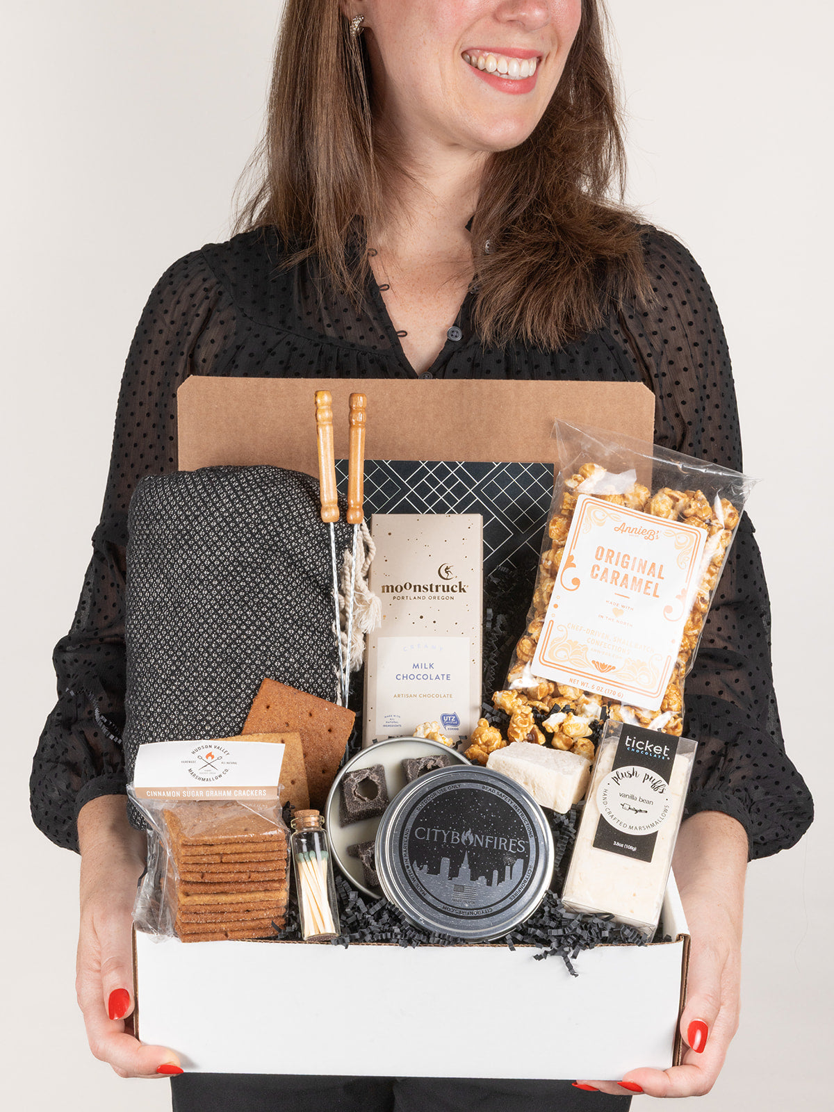 Includes a cozy blanket, food-safe mini fire pit with glass match jar, cinnamon graham crackers, 6-pack of large specialty marshmallows, milk chocolate bar, caramel popcorn, 2 skewers with wooden handles, and your message on a handwritten note.