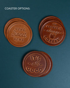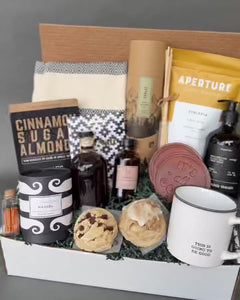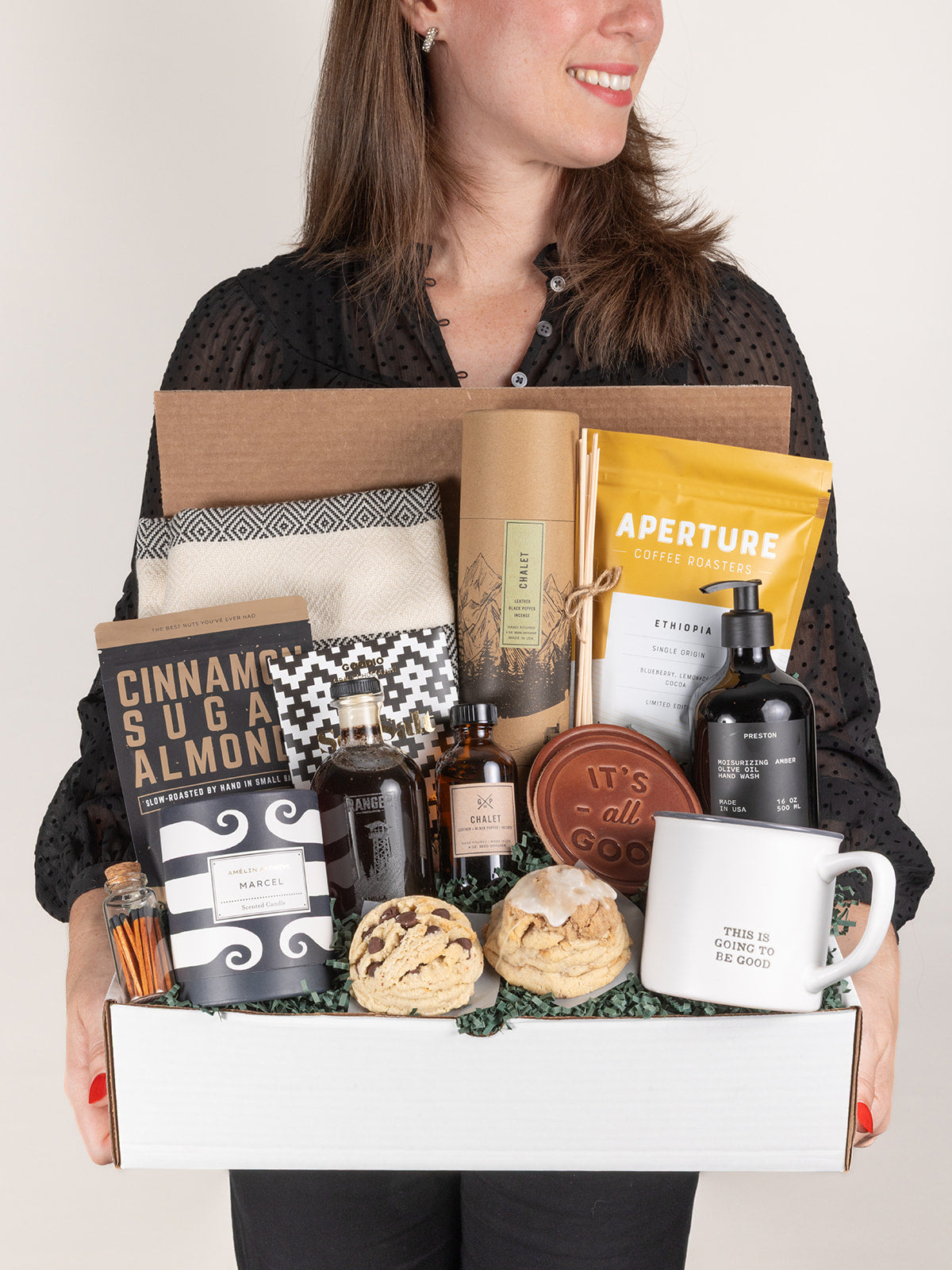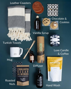 Features coffee, Turkish hand towels, reed diffuser, hand soap, genuine leather coasters, mug, cookies, vanilla coffee syrup, candle, matches, candied almonds, chocolate, and your message on a handwritten note.