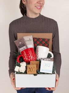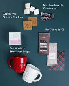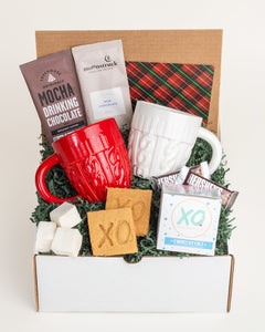 Features two knit style mugs, s'mores for two kit, two drinking chocolates, and your message on a handwritten note.