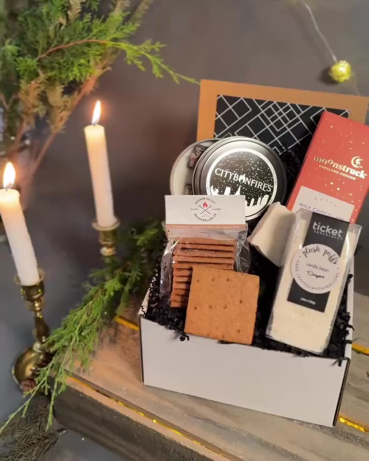Includes a food-safe mini fire pit, graham crackers, 6-pack of specialty marshmallows, craft chocolate bar, and your message on a handwritten note.